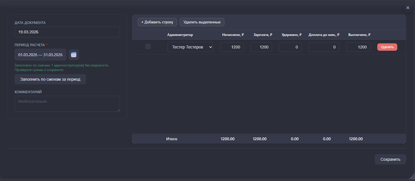 Для отключенной настройки автоматической выплаты зарплаты при пересменке, добавлена возможность автоматического расчета зарплаты в документе "Ведомость на выплату зарплаты"