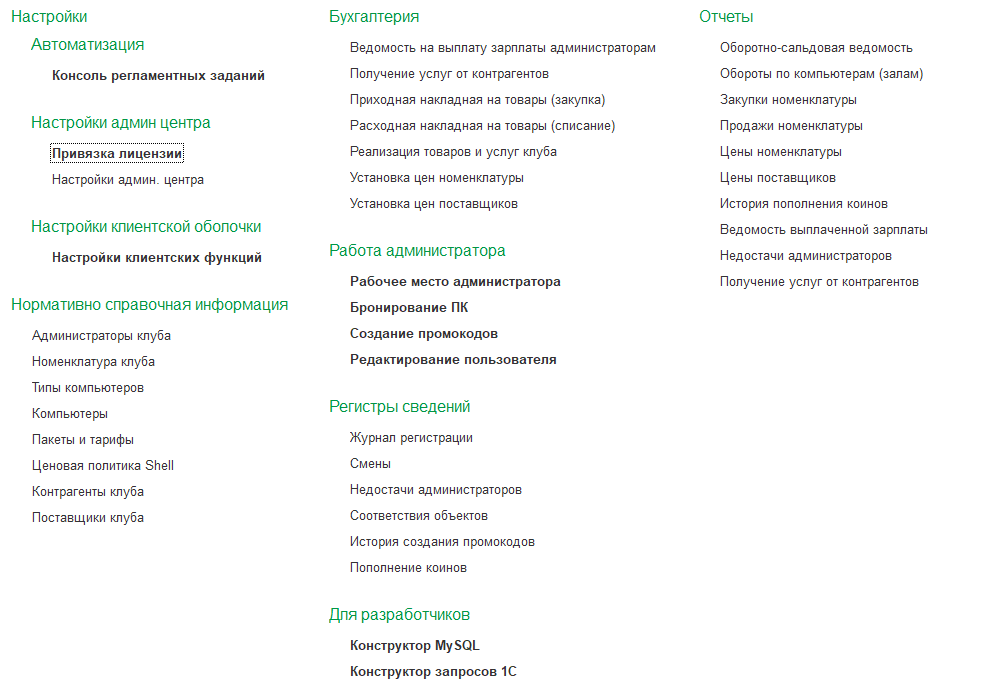 Данная инструкция описывает процесс настройки административного центра конфигурации "Компьютерный клуб" CYBSOFT. Настройки позволяют настроить автоматический расчет зарплаты администраторов, работу с недостачами, ночные коэффициенты и другие параметры работы клуба.