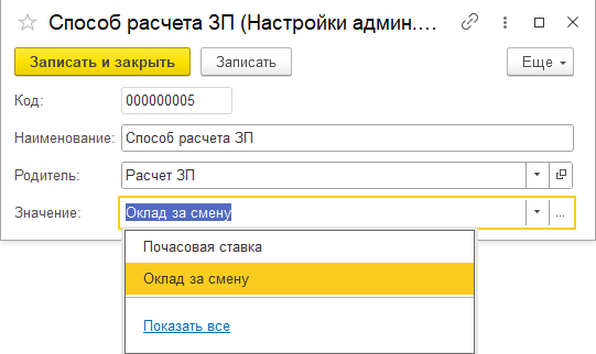Настройка "Способ расчета ЗП" определяет метод расчета заработной платы администраторов.